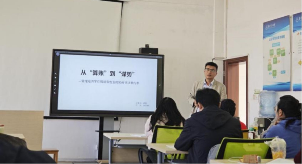 讲座现场,阚超以服装零售业为锚点,从“算账”的成本收益精细化管理切入,延伸至“谋势”的行业趋势研判与战略布局,用真实丰富的商业案例剖析管理经济学在市场中的应用智慧,为MBA学员搭建起理论落地的实践桥梁。互动环节中,阚超就学员关切问题逐一解答,用切身经历提供实用思路。